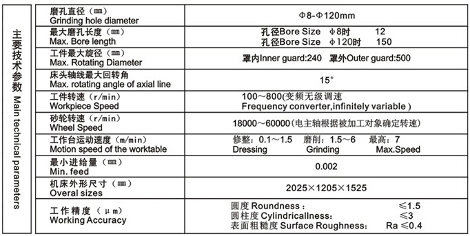 2、砂轮轴采用高刚性、高精度的电主轴。配油雾润滑、配静止变频器。砂轮可作微量的横进给,进给量为0.002mm;工作台的每一往复行程能使砂轮自动进给一次。