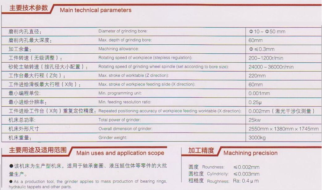 1、机床为两轴伺服驱动控制进给,主要用于磨削套圈内孔或套类零件的内孔。